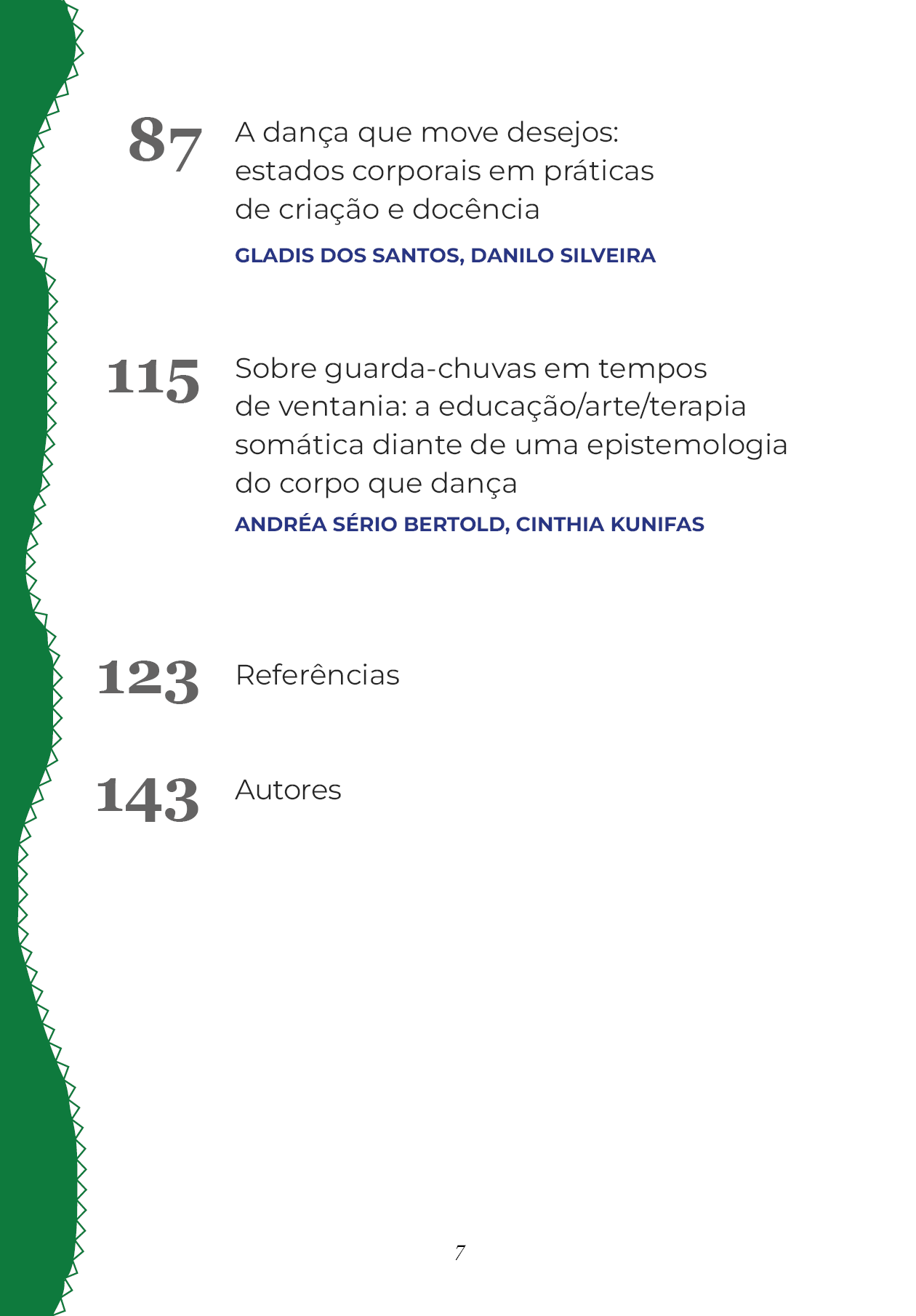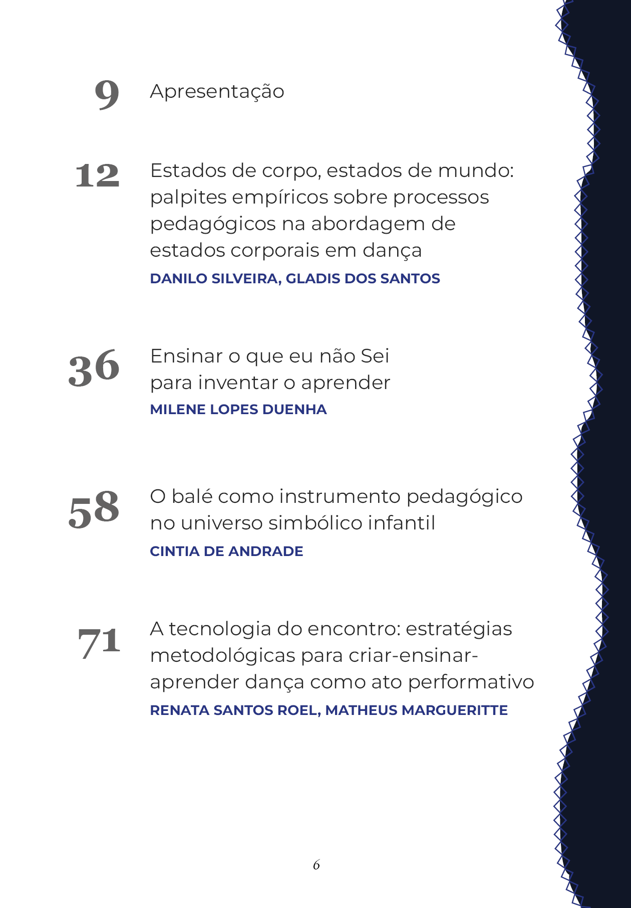 Este livro é escrito por autores e autoras que são artistas-docentes, pesquisadores e tem a dança como forma de produção de conhecimento capaz de afirmar a vida e provocar mutações nos corpos, nas relações e no mundo. A dança em sua pluralidade tecida a partir dos entrecruzamentos indissociáveis entre educação, arte e sociedade, onde escrever também é um fazer e só poderia, nesse campo cheio de forças, tensões, questões e afetos, aparecer, como o corpo que vibra, urgente, em sua ânsia de estarmos juntes e reexistir elaborando outras saídas a fim de inaugurar futuros para o que está dado, acomodado e não confiamos, acreditamos e nem nos orgulhamos mais.